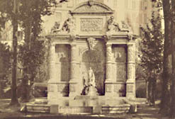 La grotte photographiée vers 1860, | En 1799, le Palais du Luxembourg devient le siège du Sénat conservateur. D’importants travaux sont menés tant dans le palais et ses dépendances que dans le jardin. La grotte n’est pas oubliée. Chalgrin, alors architecte du palais, la fait restaurer. Il s’adresse aux sculpteurs Duret, Ramey et Talamona pour restituer les figures fluviales alors ruinées. Les armes des Médicis et de Henri IV sont remplacées par un simple rectangle à congélations. Il fait placer dans la niche principale une petite Vénus en marbre et transforme la grotte en fontaine en alimentant en eau le petit bassin situé au devant. Dans les années 1850, elle est isolée des constructions auxquelles elle était adossée et les murs qui la prolongeaient de part et d’autre sont démolis. Alphonse de Gisors, architecte du palais, la dote alors d’un bassin beaucoup plus vaste. |