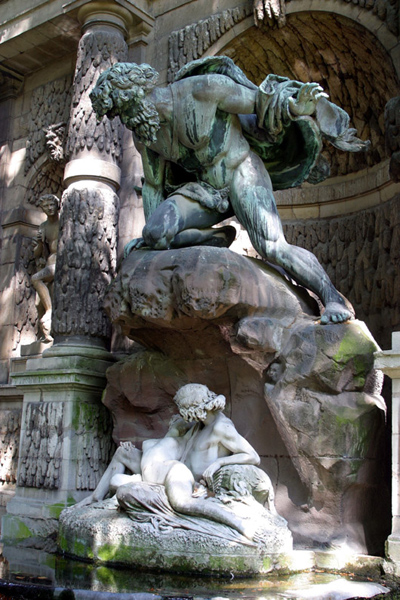 La niche centrale est occupée par un groupe en marbre représentant Acis et Galathée couchés sous un rocher au sommet duquel apparaît la figure colossale en bronze de Polyphème s’apprêtant à lancer sur son rival la pierre qui doit lui donner la mort.